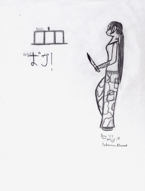 Allie - 04 May 2003 01:47 pm Post subject: simple comments! dont like it...tell meeeee ;-; i like any comments Eli - 04 May 2003 04:07 pm Post subject: I like! it beats the hell out of anything i draw But what is she going after with the knife? darkangleofdeath - 04 May 2003 04:39 pm Post subject: well just so you know i teach art to sertan people and i know what im talking about, your might want to make the pants longer to hide the shoes cus is looks like you dont like drawing feet very much or make the feet longer on the front Total Trinity - 05 May 2003 08:28 am Post subject: Better that anything I can draw, but... I still like it. ~Trinity~ Allie - 05 May 2003 01:57 pm Post subject: