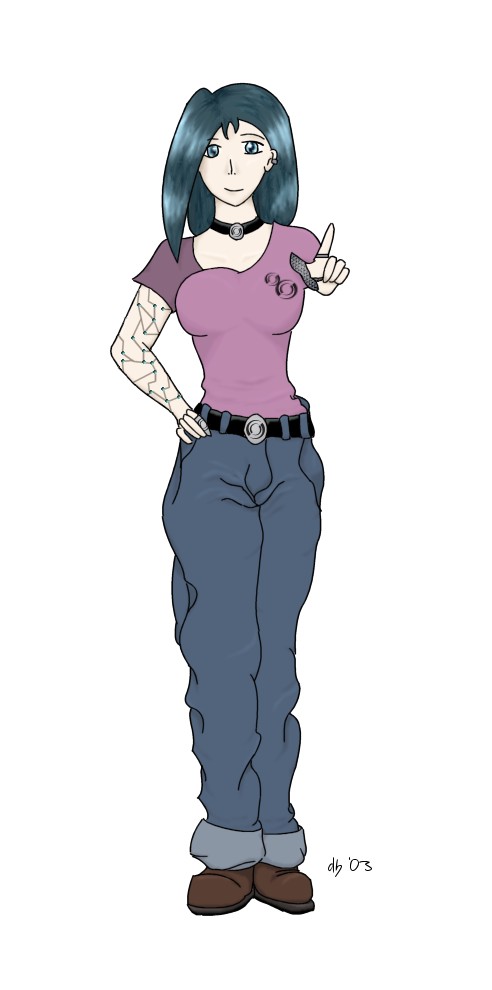 Sledgstone - 08 Jul 2003 07:09 am Post subject: cool. i like the pants! ^_^ btw.. is that a tatoo on her arm or some kind of technilogical thing?